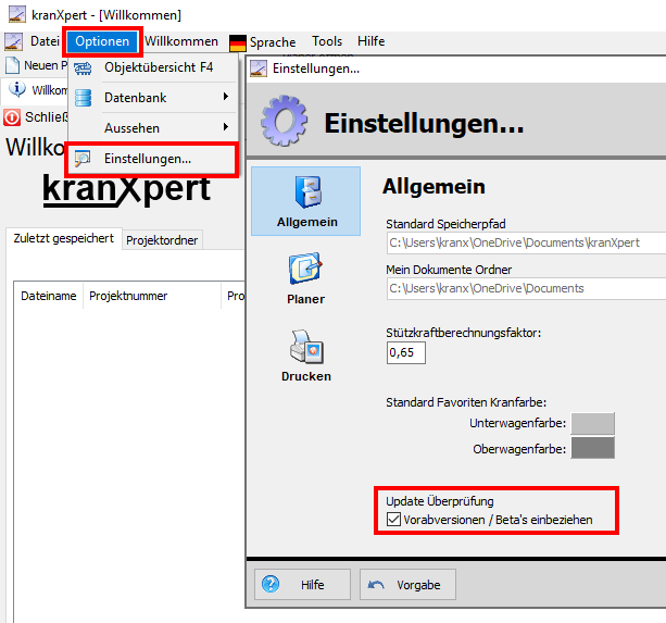 Wählen Sie im Hauptmenü 'Optionen' dann 'Einstellungen...' aus, auf der Seite Allgemein im Bereich Update Überprüfung ist eine Auswahlbox 'Vorabversionen / Beta's einbeziegen', aktivieren Sie dieses Kontrollkästchen wenn Sie Beta's bzw Vorabversionen installieren möchten.Nach dem starten von kranXpert und wenn eine Beta verfügbar ist wird Ihnen im Willkommensfenster ein Update Schaltfläche dargestellt.