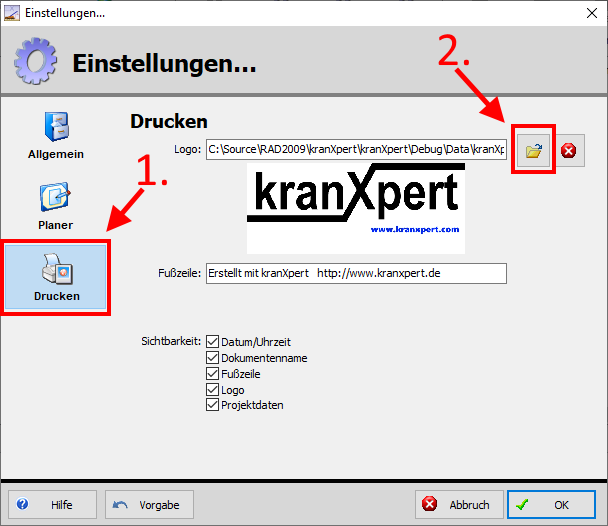 Wechseln Sie auf die Einstellung 'Drucken' Seite, dort können Sie durch einen klick auf die Bild öffnen Schaltfläche Ihr gewünschtes Firmenlogo auswählen.