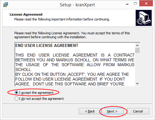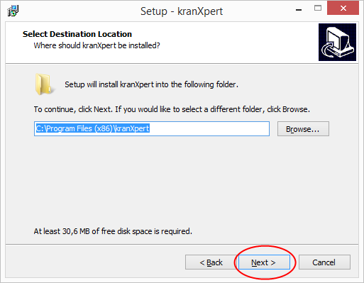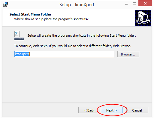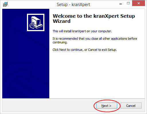 Execute the kranXpert client setup application 'SetupClient.exe' and click on the 'Next >' button.