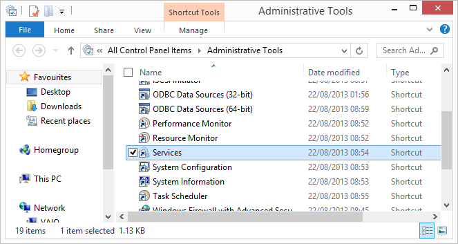 Start the Services application in the 'Administrative Tools' from the 'Control Panel'.