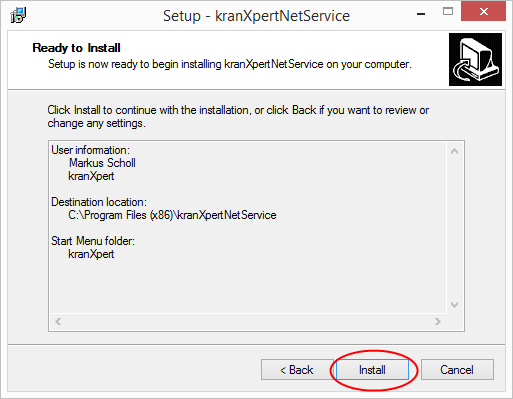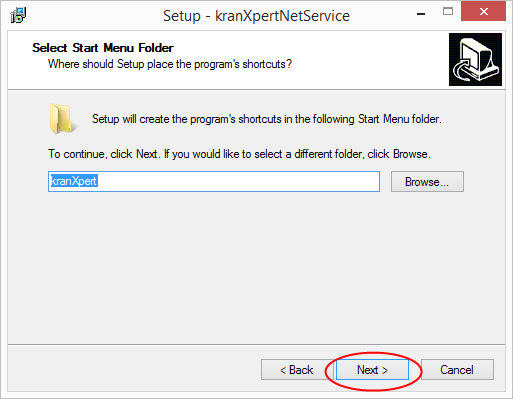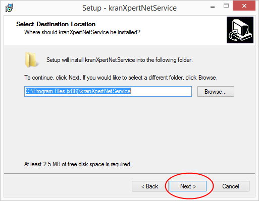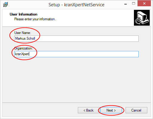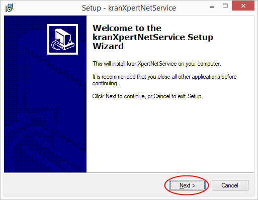 To install the kranXpert licence manager execute the setup file 'SetupNetService.exe' and click on the 'Next >' button.