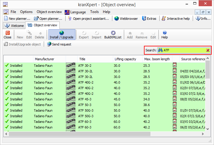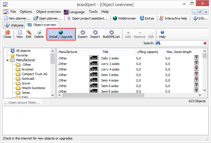After you have all cranes that you need imported click again on the Install/Upgrade button to come back to the Object overview list.