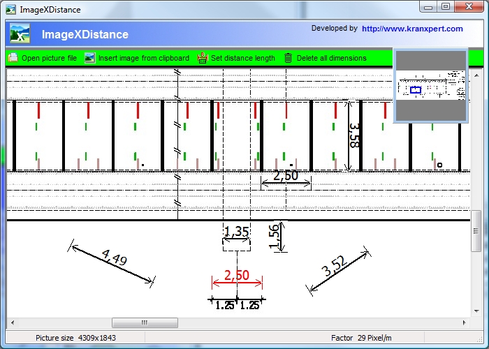 With the free software ImageXDistance you can quickly and easily import ground plans or Google Earth/Bing imagery to scale for use within Kranxpert. All that you have to do is set the distance length of the red dimensioning line and then everything else is imported to scale and cane be properly measured within Kranxpert.