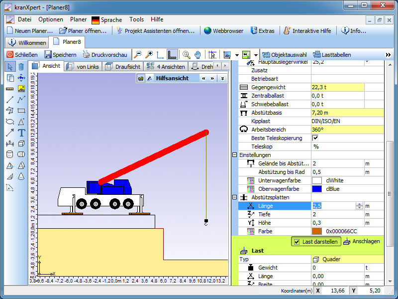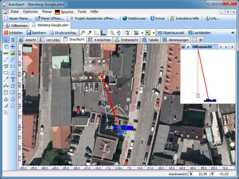 und setzt die Distanzlänge. Durch zeichnen von Bemaßungen in das Bild erhält man die Längen.kranXpert Pocket-PC