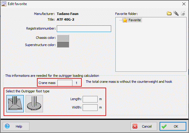 For the outrigger load calculation you need to add the crane as a favorite and insert the crane mass.